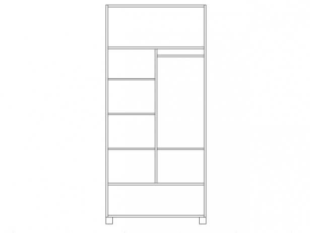 - po otwarciu drzwi szafa podzielona jest na 3 części: półka od góry, miejsce na ubrania wiszące i kilka półeczek.